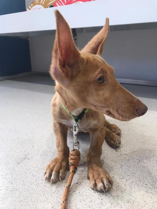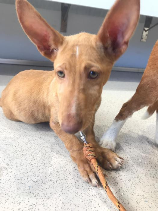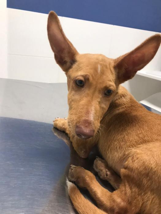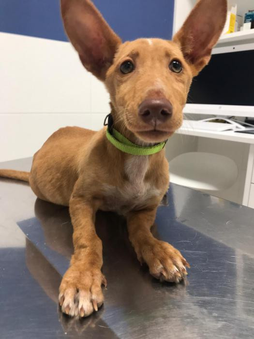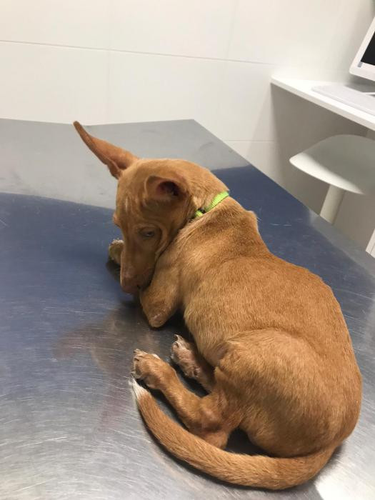 Trevo tiene rotas y soldadas las patas de atrás, malformaciones en la columna, deshidratación severa y el estómago lleno de comida sin digerir, a priori no nos dan muchas esperanzas para él :( está ingresado, le hicieron pruebas y sus huesos casi no se aprecian en las radiografías, el equipo veterinario está investigando pero creen que puede tratarse de una enfermedad congénita rara o la llamada huesos de cristal.