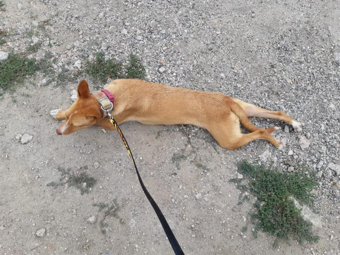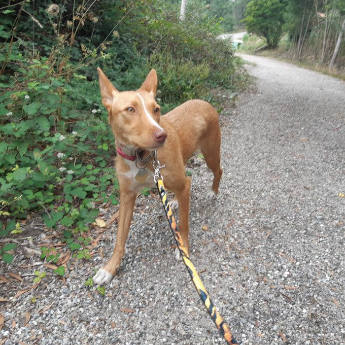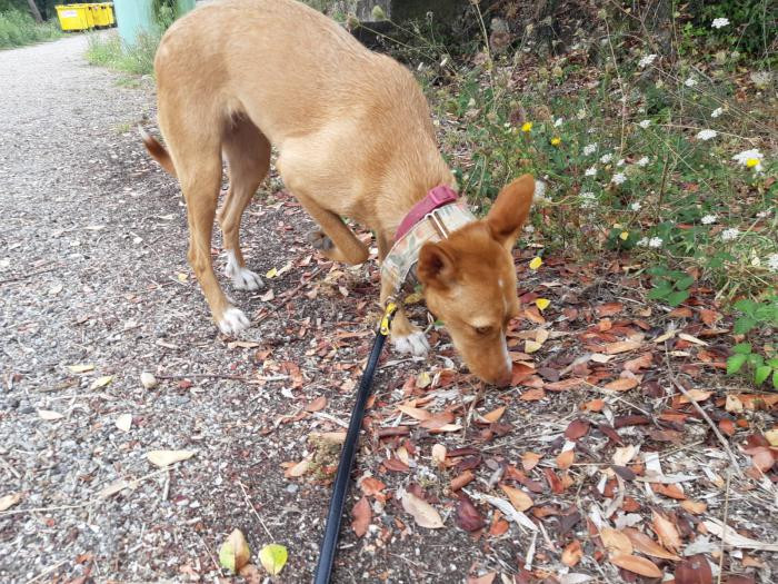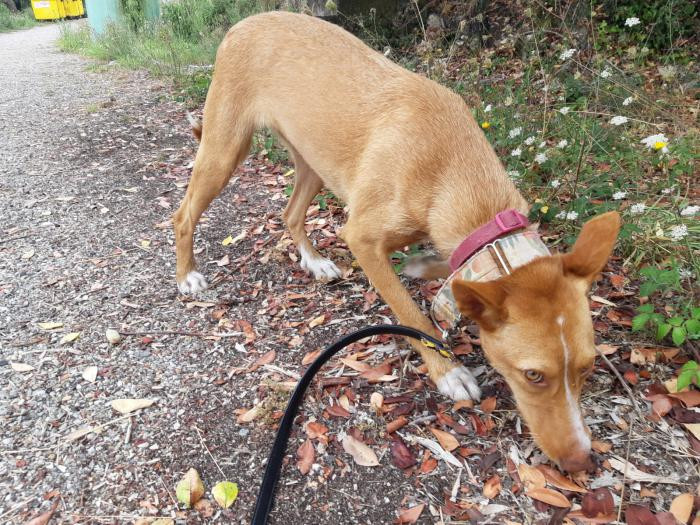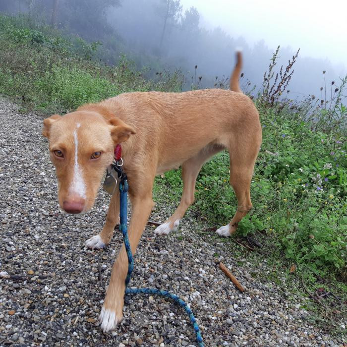 Gaia apareceu moi asustada no monte pero dende o principio foi unha cadeliña moi agarimosa.Se queres que sexa parte da túa familia Gaia estaría encantada.Ten moitas ganiñas de sair do refuxio, é unha podenquiña adorable a verdade