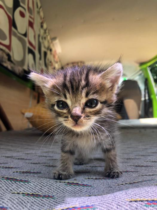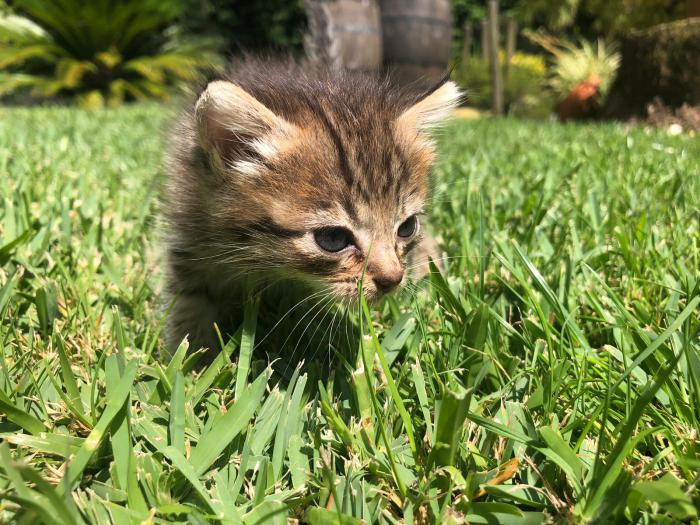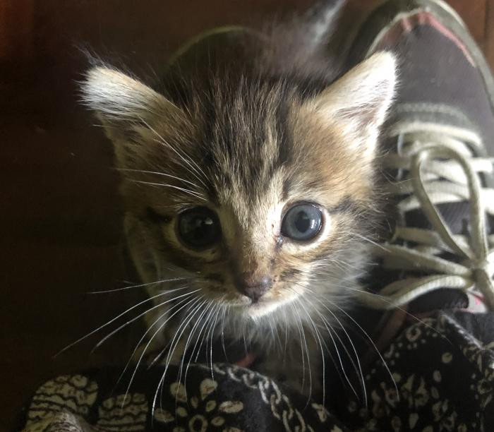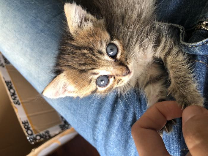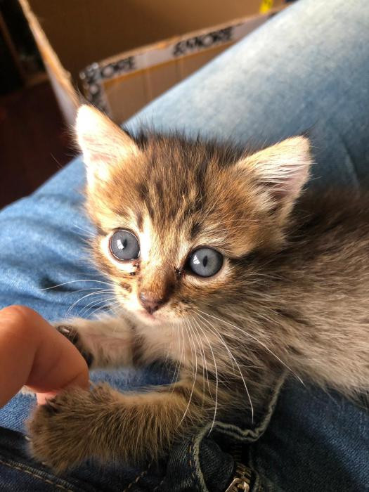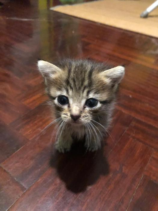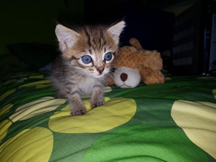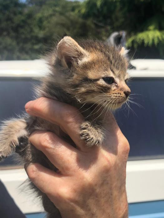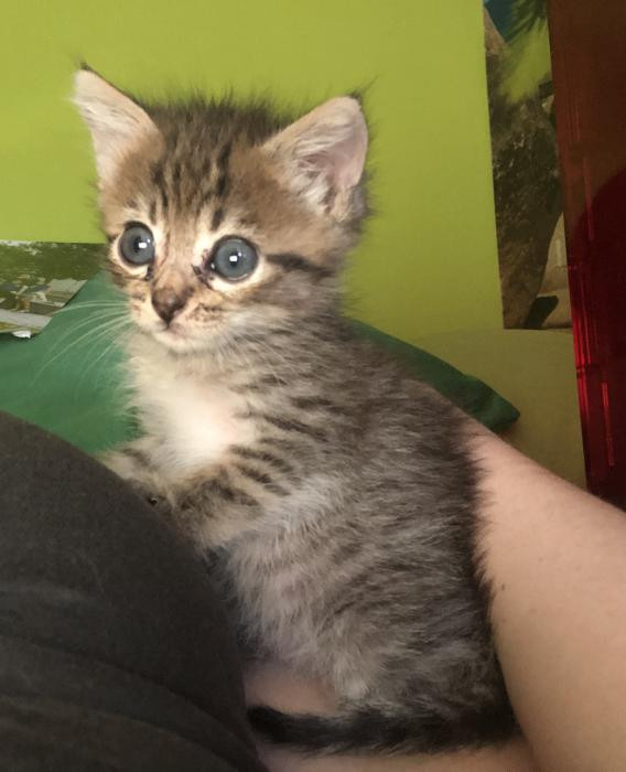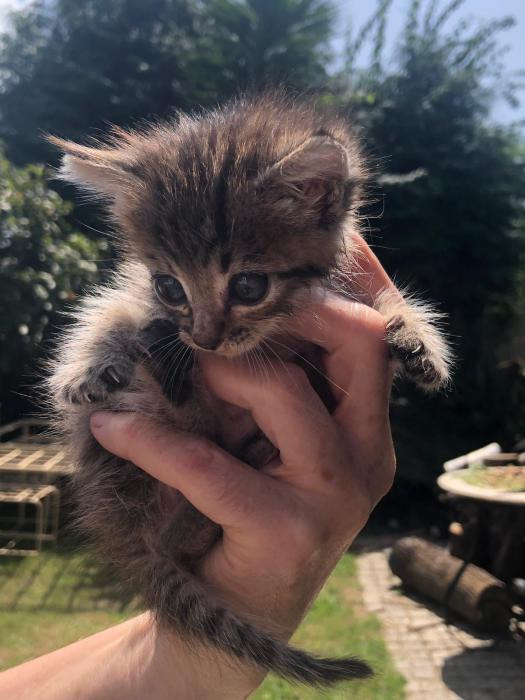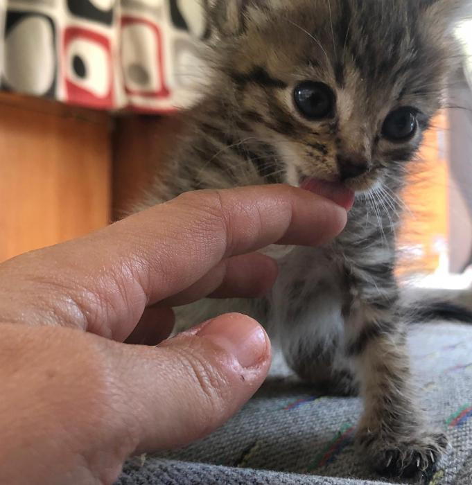 Foi atopada empapada e desnutrida un dia de temporal a piques de morrer pero grazas a que tivo forzas para chamar forte puidemos escoitala e rapidamente darlle calor. Despois de alguns dias a biberon xa sabe comer latiña ela sola e está xa recuperada.