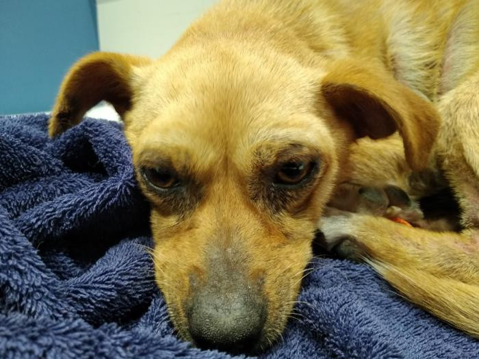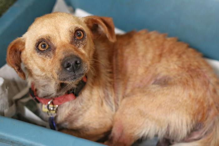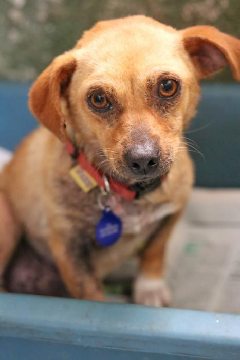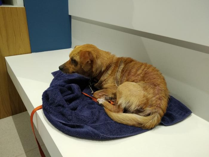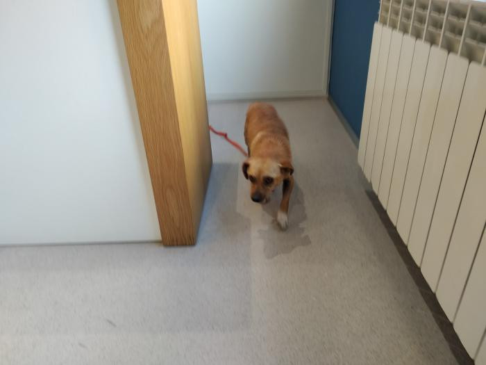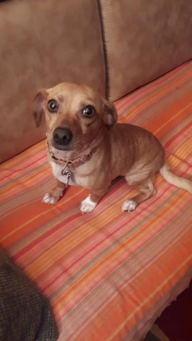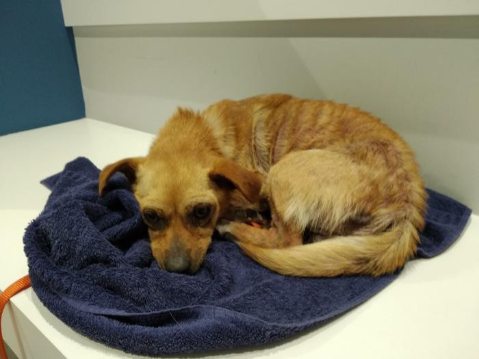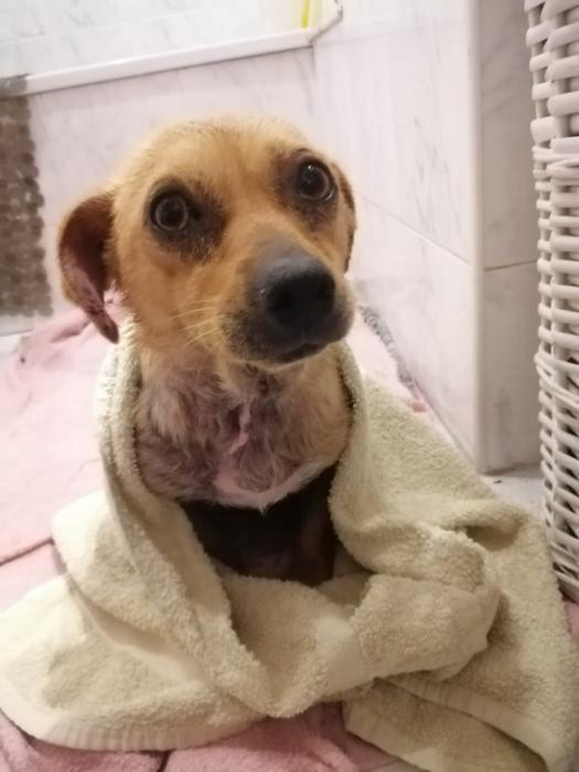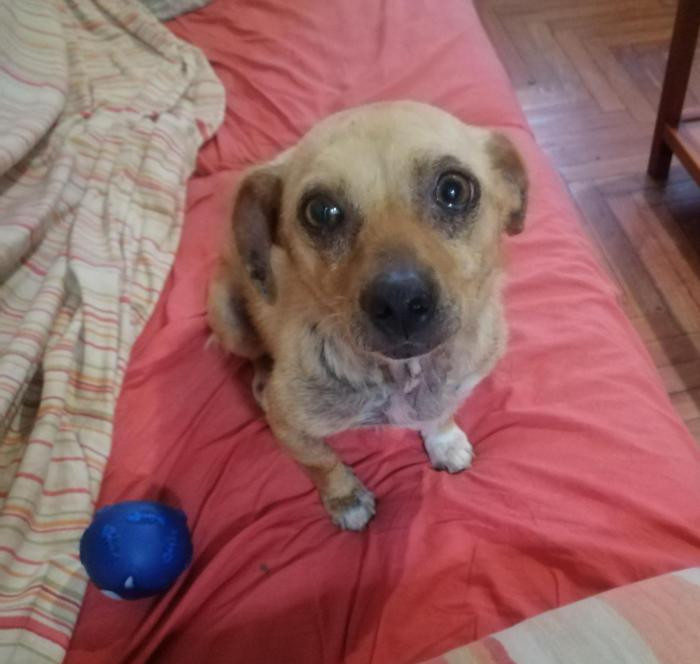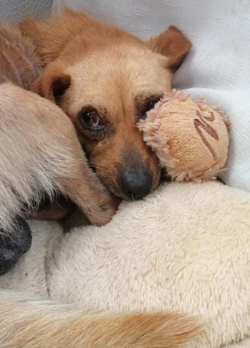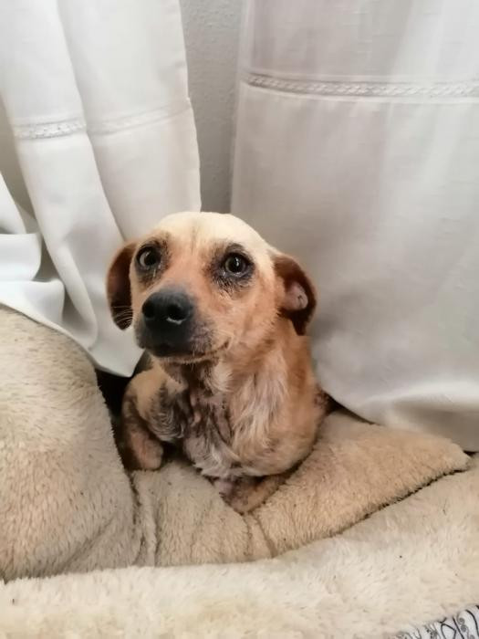 Petisco fue recogido de la calle con una grave infección de piel. Es un perro de tamaño pequeño y carácter sociable con animales y personas, juguetón y que se adapta muy bien a la vida en familia.