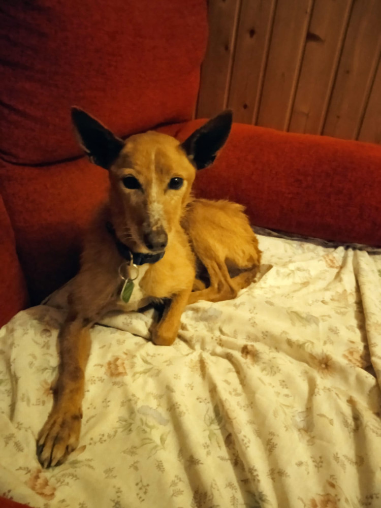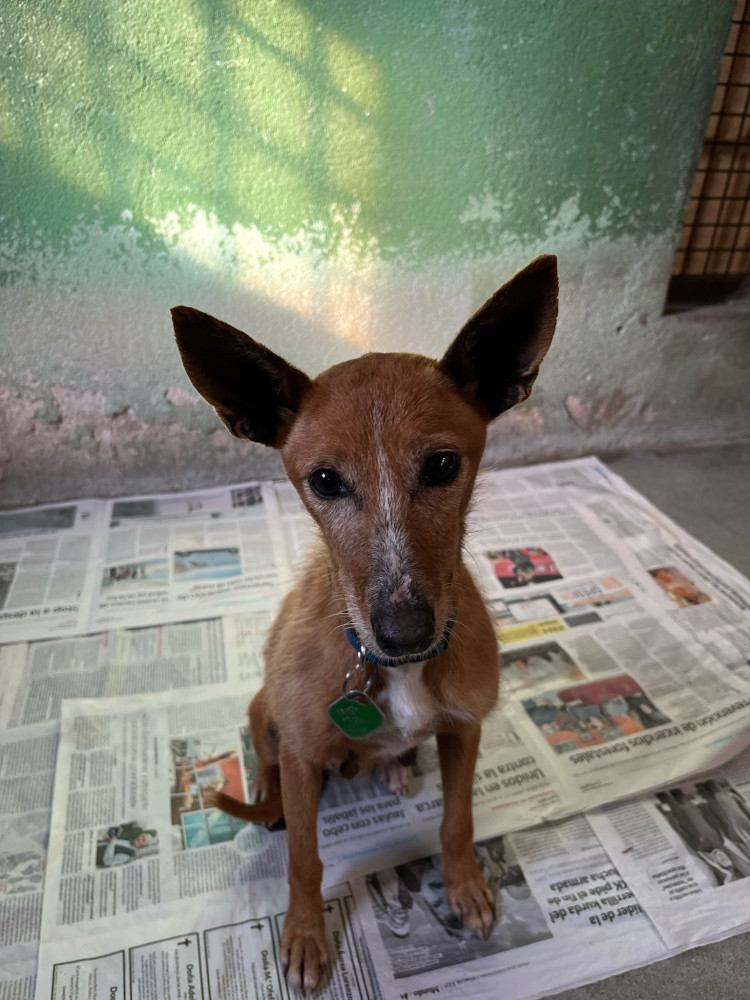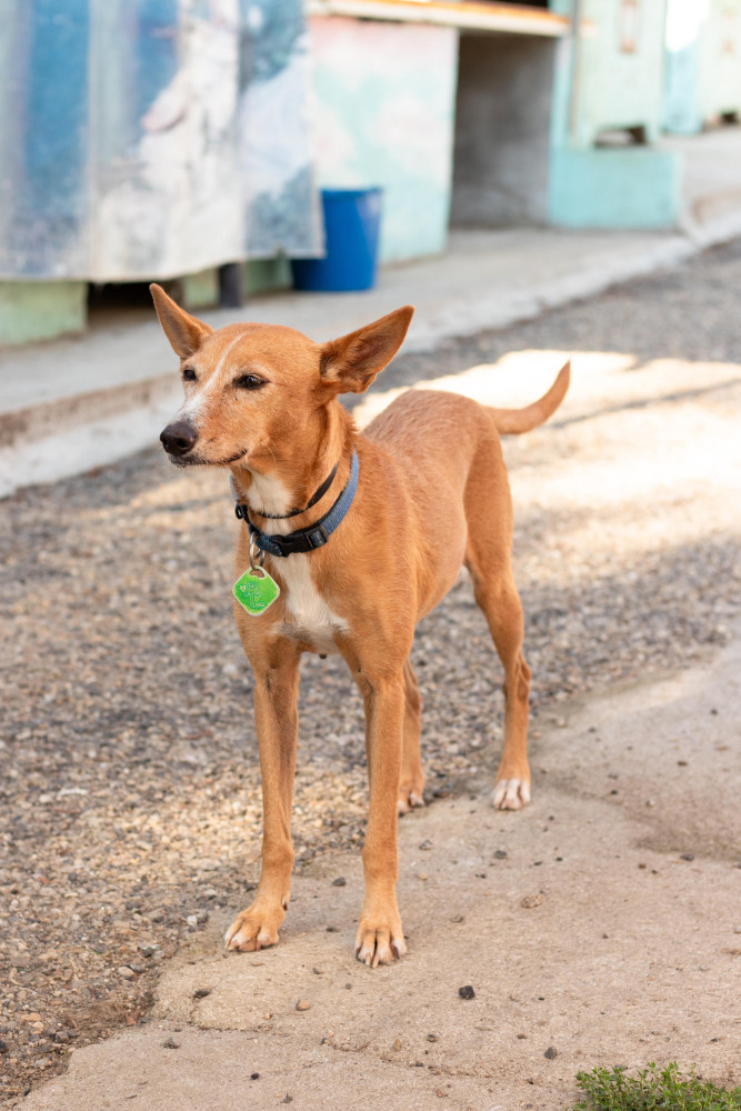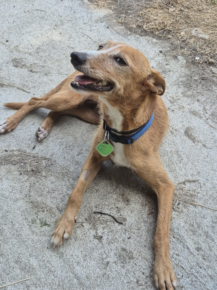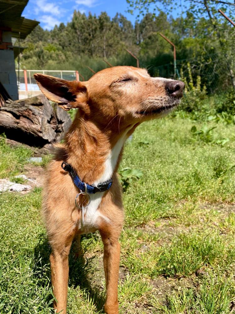 A pesar de haber sido abandonada, no guarda rencor al ser humano y se deja mimar. Le encanta seguirte moviendo el rabito y disfrutar del solete.